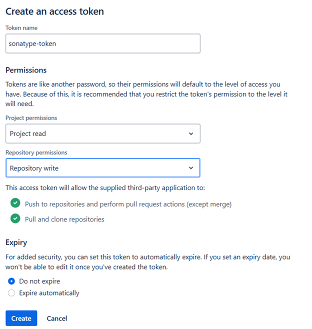 Sonatype; GitHub, GitLab, Bitbucket, Azure gibi birçok SCM sistemiyle entegre olabilmektedir. Yazımızdaki Bitbucket (on-prem) üzerinden ilerleyeceğiz. Öncelikle Bitbucket üzerinden access token oluşturmalıyız. Görseldeki gibi en az project seviyesinde read, repository seviyesinde write yetkisi gerekmektedir.